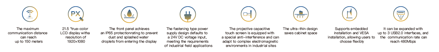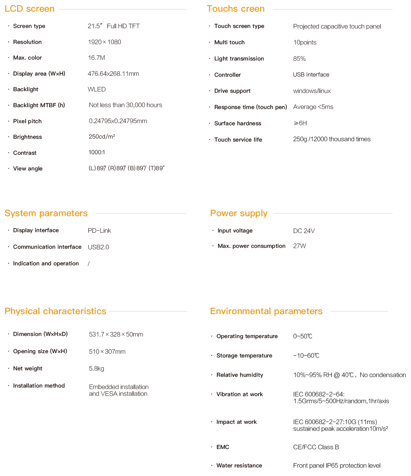 PD-8621 is a high-performance industrial remote transmission touch display panel. It is equipped with a 21.5 "high-definition LCD screen with a resolution of 1920x1080. Support the PD-Link display interface. By default, it supports a 24V DC power input. The power connector adopts a secure green terminal to prevent accidental detachment during use. The touch screen adopts a projected capacitive touch screen, supporting up to 10 touch points at most. The display and touch sections have a special anti-interference design, which can effectively resist the interference from high-power motors, servos, etc. in industrial sites. Ensure good display effect and touch experience, and adapt to various industrial sites with complex electromagnetic environments.