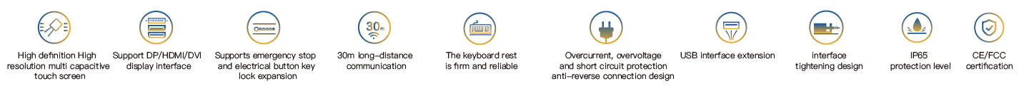 The PDS-6821 is a horizontal industrial touch panel with an upper cantilever installation. It is equipped with operation buttons and a keyboard stand, featuring a 21.5 "high-definition LCD screen with a resolution of 1920x1080 and a projected multi-touch capacitive screen. It supports three signal transmission interfaces: HDMI, DVI and DP, as well as multiple USB2.0 interface expansions. The maximum communication distance between the PC and the touch panel can reach 30 meters, and the entire machine is powered by DC24V. The front panel has an IP65 protection rating. All interfaces are designed with fastening and have passed CE/FCC certification, making it suitable for demanding human-machine interaction industrial sites.