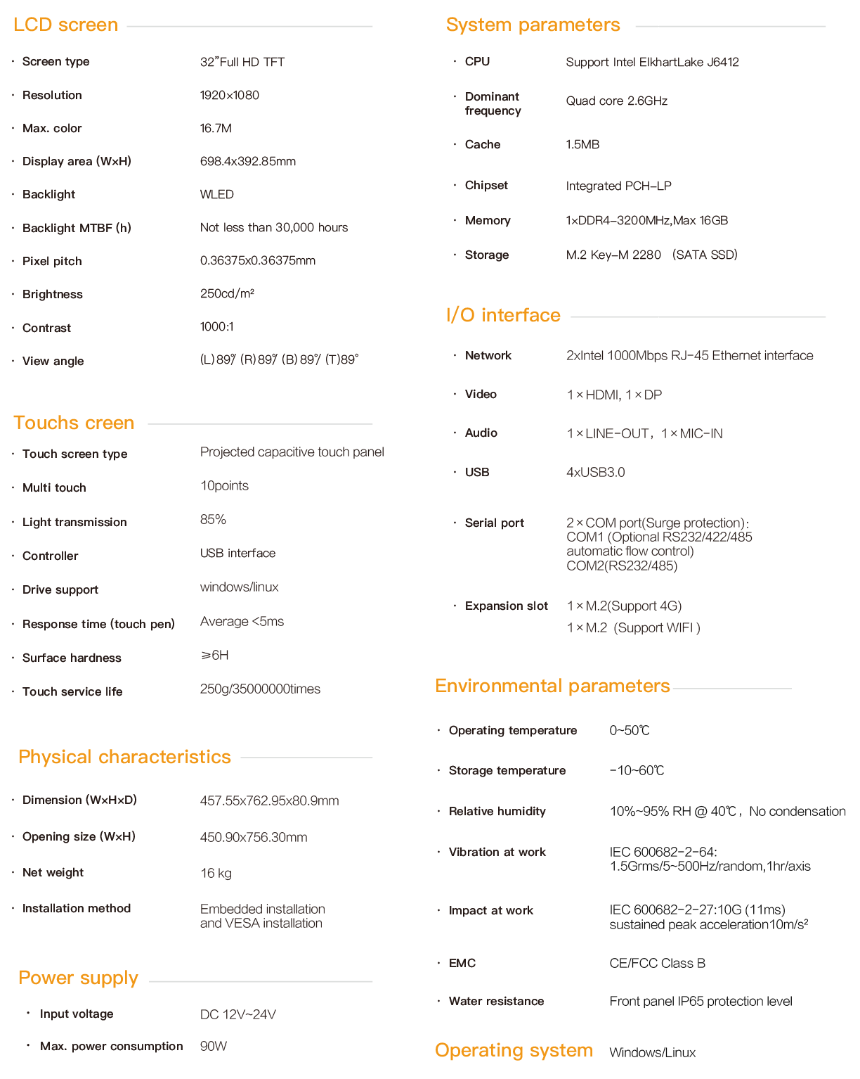 TPC-5632 is an embedded industrial capacitive touch tablet computer. It adopts a fanless and silent design, combining industrial display and touchscreen technology. The product is compact in structure, easy to install and convenient to operate. It is a high-performance and highly reliable industrial computer system. The whole machine adopts a 32-inch high-definition LCD screen with a resolution of 1920x1080, featuring rich and delicate colors and a wide viewing Angle. It is powered by a 12-24V wide-voltage DC and is equipped with a round-mouth DC power connector with locking screws to prevent accidental detachment. The touch control adopts a projected capacitive screen and supports 10-point touch simultaneously. The main unit is based on the IntelElkhartLake processing platform CPU, equipped with the J6412 processor and a large-capacity solid-state SSD. DDR4 memory supports 1x16G capacity, 4xUSB3.0, dual intel gigabit network cards, COM1 port supports RS232/422/485, COM2 port supports RS232/485. There is one M.2 expansion slot inside for 4G expansion, another M.2 for WIFI expansion, and one HDMI and one DP interface for multi-display mode. The TPC-5632 supports multiple installation methods: hook-mounted embedded installation, VESA-based wall-mounted and cantilevered installation. The front panel complies with the NEMA/IP65 water and dust resistance standard, preventing water splashes from entering during installation in the control cabinet. The high-strength all-steel sealed box structure has the functions of shock resistance and vibration protection. Especially, the specialized EMC design enables the entire machine to have excellent anti-interference ability and be able to adapt to the harsh working environment in industrial sites. It is widely applied in industrial scenarios with strong interference such as factory automation, mechanical manufacturing, numerical control equipment, textile equipment, communication networks and power automation.