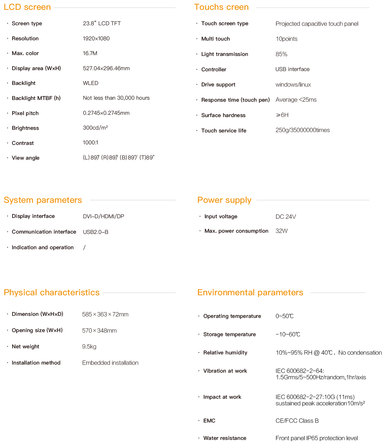SPD-2400E is an embedded ultra-thin industrial touch panel. It is equipped with a 23.8-inch high-definition LCD screen with a resolution of 1920×1080 and a projected multi-point capacitive touch screen. Supports HDBaseT and DP signal transmission interfaces, with multiple USB interface expanders. The maximum communication distance between the PC and the touch panel can reach 100 meters, and the entire machine is powered by DC24V. The front panel has an IP65 protection rating. All interfaces are designed with fastening and have passed CE/FCC certification, making it suitable for demanding human-machine interaction industrial sites.