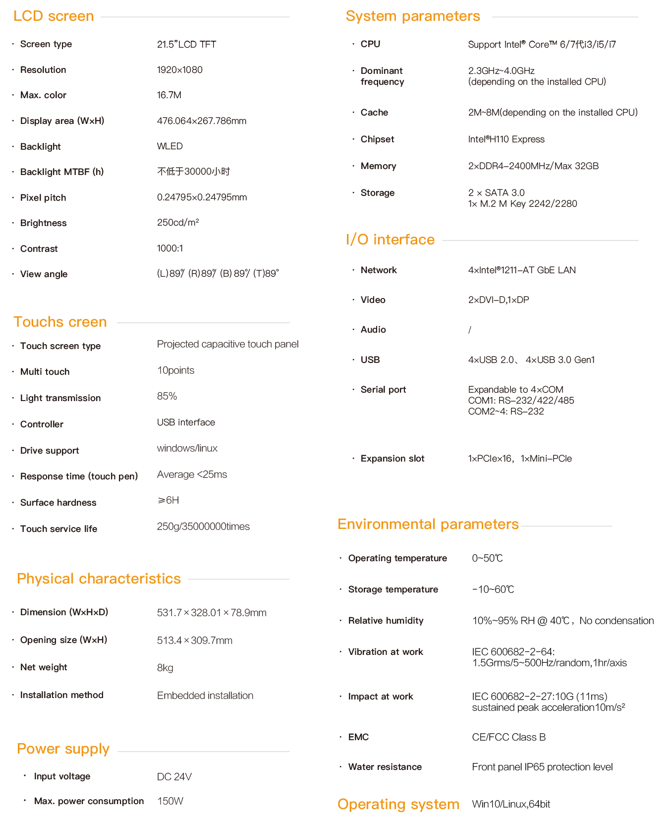 The HPC-9621 is an industrial capacitive touch tablet computer that combines industrial display and touch screen technology. The product has a compact structure, is easy to install and operate, and is a high-performance and highly reliable industrial computer system. The whole machine adopts a 21.5-inch high-definition LCD screen with a resolution of 1920*1080, featuring rich and delicate colors and a wide viewing Angle. It is powered by 24V DC and adopts a projected 10-point capacitive screen. The mainframe part is equipped with Intel Core 6th / 7th generation cpus. Configurable large-capacity solid-state SSD, with memory support up to 32G capacity. The HPC-9621 supports hook-type embedded installation. The front panel complies with the IP65 water and dust resistance standard, preventing water splashes from entering during installation in the control cabinet. The high-strength all-steel box structure features shock resistance and vibration protection functions. Especially, the specialized EMC design enables the entire machine to have excellent anti-interference ability and be able to adapt to the harsh working environment in industrial sites. It is widely applied in industrial sites with strong interference such as factory automation, mechanical manufacturing, numerical control equipment, textile equipment, communication networks and power automation.