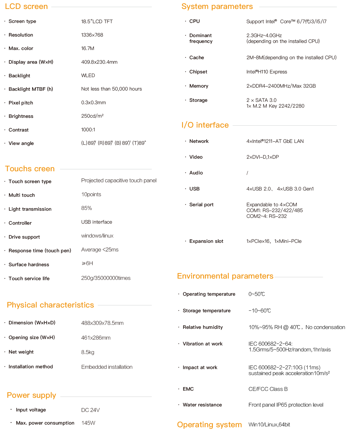 NPC-184i is an industrial capacitive touch tablet computer that combines industrial display and touch screen technology. The product has a compact structure, is easy to install and operate, and is a high-performance and highly reliable industrial computer system. The whole machine adopts an 18.5-inch high-definition LCD screen with a resolution of 1366*768, featuring rich and delicate colors and a wide viewing Angle. It is powered by 24V DC and adopts a projected 10-point capacitive screen. The mainframe part is equipped with Intel Core 6th / 7th generation cpus. Configurable large-capacity solid-state SSD, with memory support up to 32G capacity. NPC-184i supports hook-type embedded installation. The front panel complies with the IP65 water and dust resistance standard, preventing water splashes from entering during installation in the control cabinet. The high-strength all-steel box structure features shock resistance and vibration protection functions. Especially, the specialized EMC design enables the entire machine to have excellent anti-interference ability and be able to adapt to the harsh working environment in industrial sites. It is widely applied in industrial sites with strong interference such as factory automation, mechanical manufacturing, numerical control equipment, textile equipment, communication networks and power automation.
