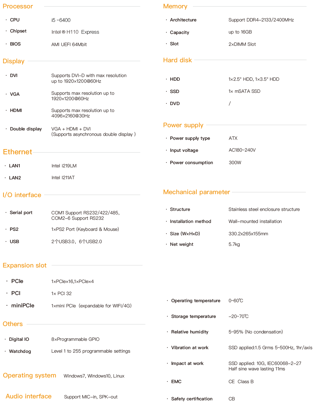 The IPC-2102 industrial control computer uses the 6th generation Intel? high-performance CoreTM i3/i5/i7 desktop CPU. Dual-fan positive air pressure dust-proof design, all-steel desktop or wall-mounted case. It supports 1 PCI bus expansion slot and 2 PCIe bus expansion slots, with good compatibility and the ability to expand various industrial control cards. It features 2 gigabit Ethernet ports and supports industrial real-time buses such as EtherCAT. Multiple USB2.0/3.0 interfaces, with one built-in USB2.0 encryption dog interface. 1 built-in miniPCIe interface for expanding WIFI/4G. The panel interface has VGA/DVI/HDMI display interfaces. Among them, the DVI interface supports long cable driving, which is convenient for equipment layout and operation. The whole machine is designed with EMC electromagnetic compatibility to ensure stable operation in a strong electromagnetic environment. The operating system supports Windows7, Windows10 and Linux. It has obtained CE and CB certifications, meeting the export requirements of the European Union.operating system supports Windows7, Windows10 and Linux. It has CE certification and CB certification, meeting the export requirements of the European Union.