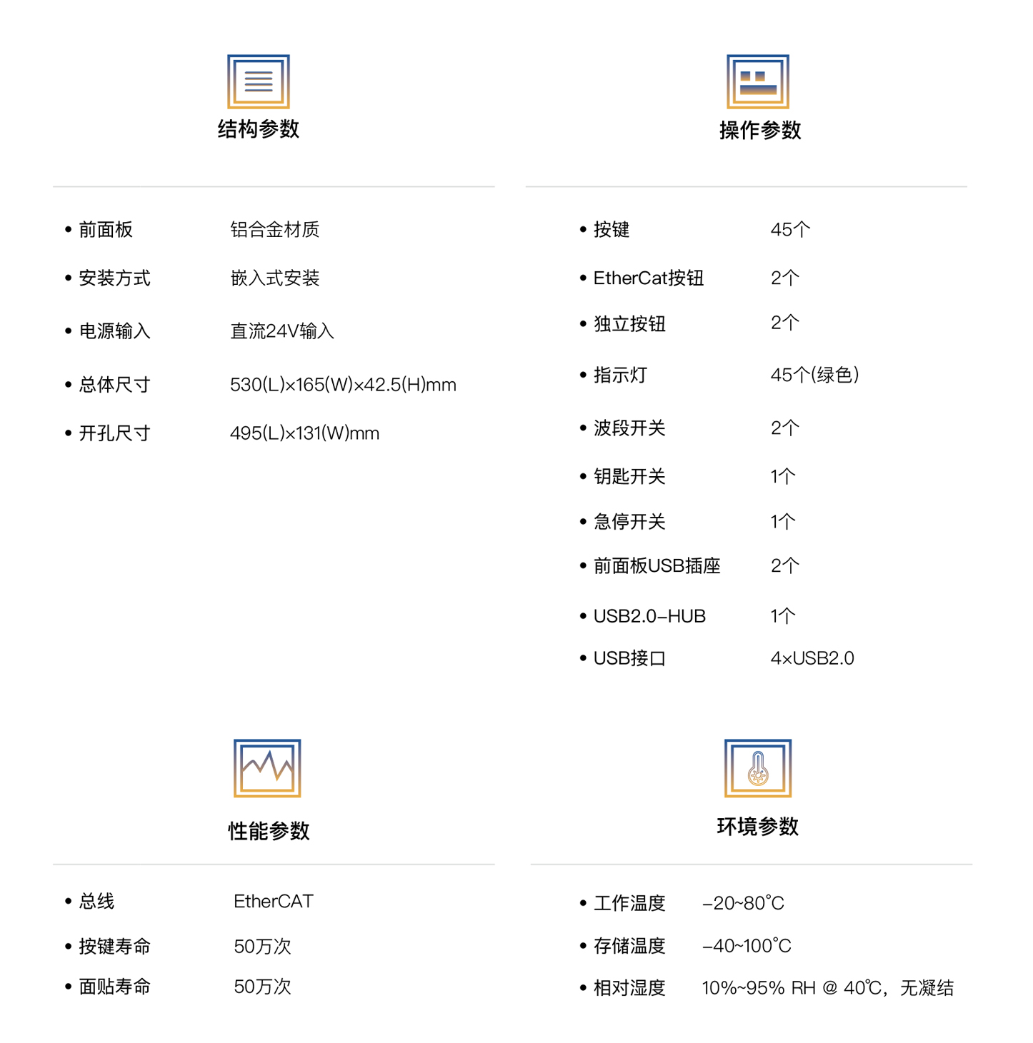 EC-8103是一款高性能基于EtherCat工業(yè)以太網總線的操作面板,實現(xiàn)高速而且可靠的人機互動,作為一款專用HMI操作面板,配備了45個操作按鍵,45個狀態(tài)指示燈,2個21檔格雷碼波段開關, 1個4口USB2.0-HUB,1個鑰匙開關,1急停開關,4個帶燈按鈕開關,整機采用抗干擾設計,適應各種電磁環(huán)境復雜的工業(yè)現(xiàn)場。通過掛鉤實現(xiàn)嵌入式安裝,便于安裝與維護。
