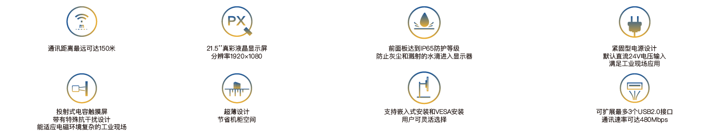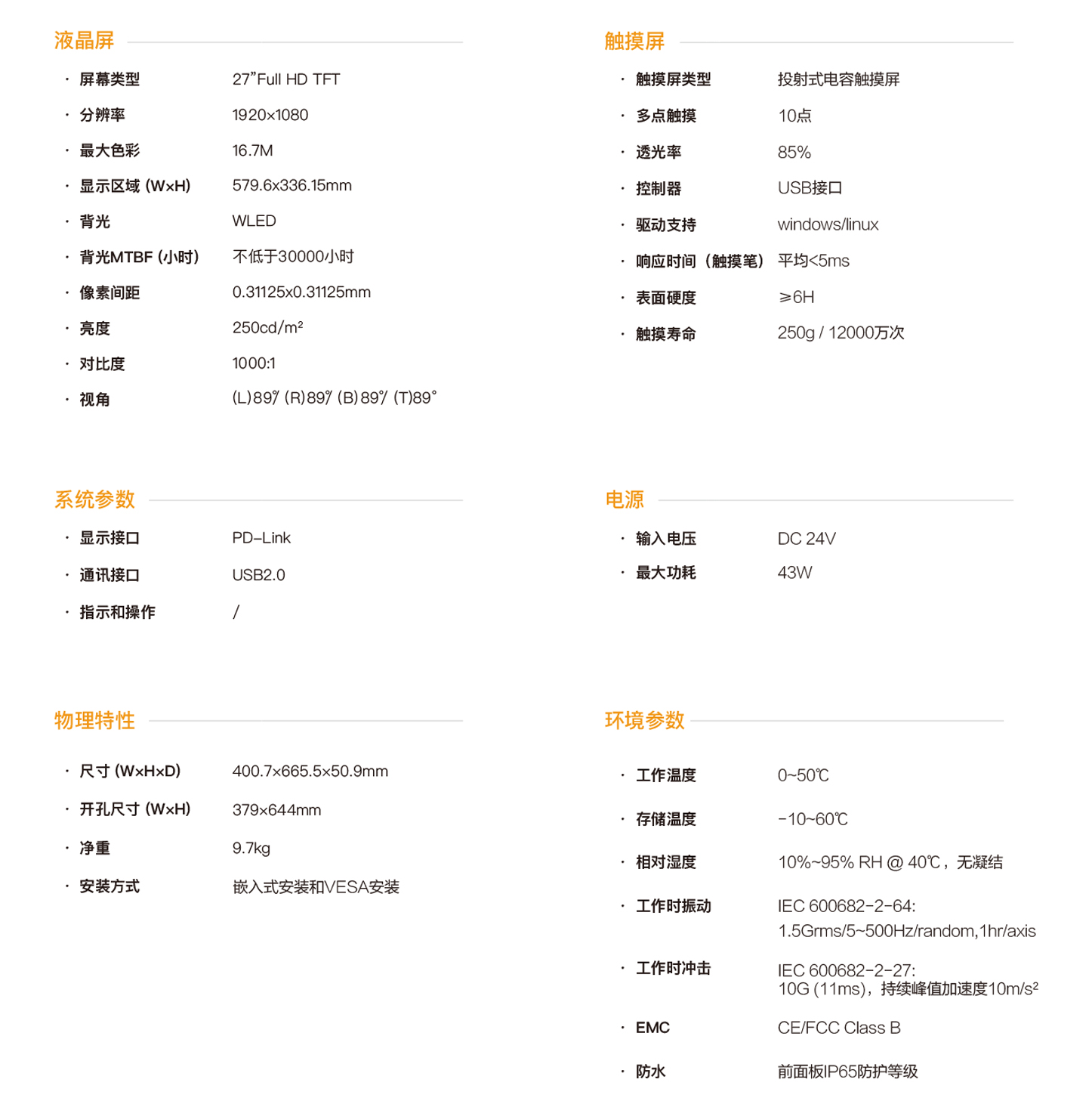 PD-8627是一種高性能工業(yè)遠傳觸控顯示面板,配備27”,分辨率為1920x1080的高清液晶顯示屏,支持PD-Link顯示接口;默認支持直流24V電源輸入,電源接頭采用緊固型綠色端子,防止使用過程中意外脫落;觸控屏幕采用投射式電容觸摸屏,最多支持10點觸摸;顯示與觸摸部分有特殊抗干擾設計,可有效抵抗工業(yè)現(xiàn)場大功率電機、伺服等干擾,保證良好的顯示效果與觸控體驗。