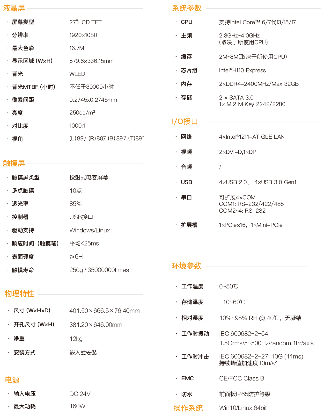 HPC-9627是一款工業(yè)型電容觸控平板電腦,將工業(yè)顯示和觸摸屏技術相結合,產品結構緊湊、易于安裝、操控方便,是一款高效能、高可靠的工業(yè)電腦系統(tǒng),整機采用27寸分辨率為1920*1080的高清液晶顯示屏,色彩豐富細膩,視角寬闊,24V直流供電,采用投射式10點電容屏,主機部分搭載Intel Core 6/7代CPU,可配置大容量固態(tài)SSD,內存支持最大32G容量。 HPC-9627支持掛鉤式嵌入式安裝,前面板符合IP65防水防塵標準,杜絕安裝在控制柜時因現場飛濺的水滴進入,高強度全鋼型箱體結構,具有抗沖擊和振動防護功能,尤其是專門的EMC設計使得整機具有優(yōu)秀的抗干擾能力,能夠適應工業(yè)現場惡劣的工作環(huán)境,廣泛應用于工廠自動化、機械制造、數控設備、紡織設備、通訊網絡以及電力自動化等強干擾的工業(yè)現場。