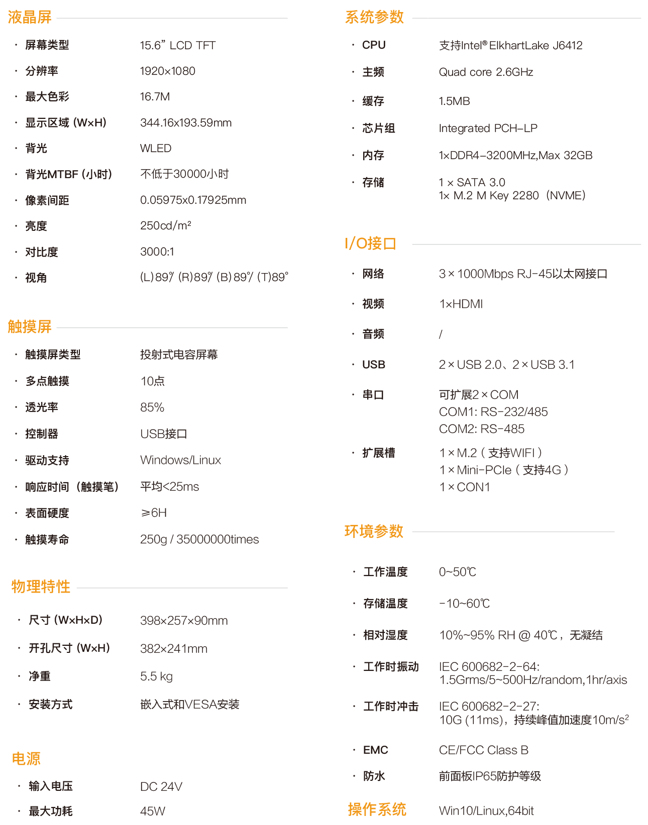 SPC-4715L是一款嵌入式工業(yè)型電容觸控平板電腦,采用 無風(fēng)扇靜音設(shè)計(jì),將工業(yè)顯示和觸摸屏技術(shù)相結(jié)合,產(chǎn)品構(gòu)成緊 湊、易于安裝、操控方便,是一款高效能、高可靠的工業(yè)電腦系 統(tǒng), 整機(jī)采用15.6寸分辨率為1920x1080的高清液晶顯示屏,色 彩豐富細(xì)膩,視角寬闊,12~24V寬壓直流供電,觸控采用投射 式電容屏,同時(shí)支持10點(diǎn)觸摸,主機(jī)部基于Intel ElkhartLake處 理平臺(tái)CPU,采用J6412處理器,配置大容量固態(tài)SSD,DDR4 內(nèi)存支持1×32G容量,4×USB接口,3個(gè)intel千兆網(wǎng)卡,可擴(kuò)展2 個(gè)COM口,COM1口支持RS232/422/485,COM2口支持 RS232/485,內(nèi)部1個(gè)Mini-PCIe擴(kuò)展插槽可支持4G擴(kuò)展,1個(gè) M.2用于WIFI擴(kuò)展,1個(gè)HDMI接口用于多顯示器模式。 SPC-4715L支持多種安裝方式:掛鉤式嵌入式安裝,基于 VESA的壁掛式和懸臂式安裝,前面板符合 NEMA/IP65 防水防 塵標(biāo)準(zhǔn),杜絕安裝在控制柜時(shí)因現(xiàn)場(chǎng)飛濺的水滴進(jìn)入,高強(qiáng)度全 鋼型密封箱體結(jié)構(gòu),具有抗沖擊和振動(dòng)防護(hù)功能,尤其是專門的 EMC設(shè)計(jì)使得整機(jī)具有優(yōu)秀的抗干擾能力,能夠適應(yīng)工業(yè)現(xiàn)場(chǎng) 惡劣的工作環(huán)境,廣泛應(yīng)用于工廠自動(dòng)化、機(jī)械制造、數(shù)控設(shè)備、 紡織設(shè)備、通訊網(wǎng)絡(luò)以及電力自動(dòng)化等強(qiáng)干擾工業(yè)場(chǎng)合。